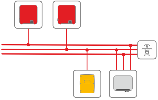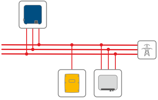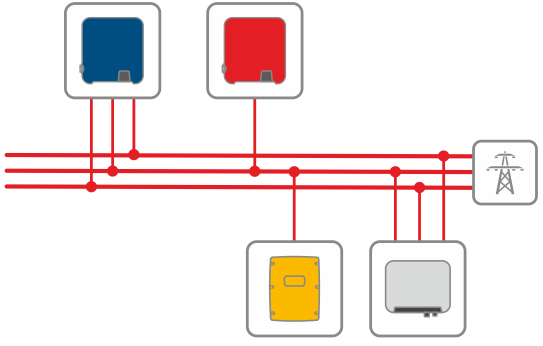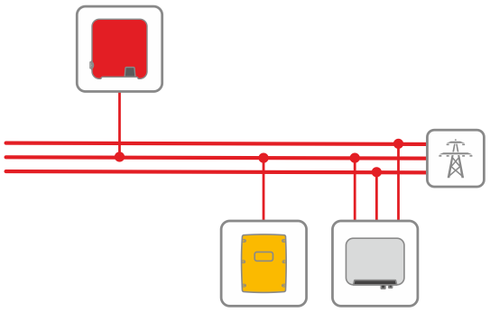 I dessa system måste den enfasiga batteriväxelriktaren vara ansluten till samma fas som en enfasig solcellsväxelriktare matar in på. Om alla anslutna solcellsväxelriktare är trefasiga kan batteriväxelriktaren anslutas till valfri fas.
